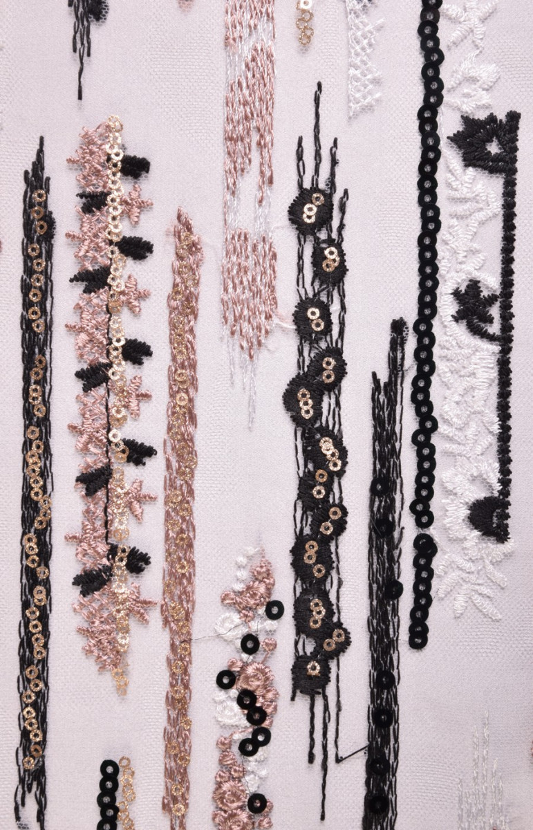 Biely tyl vyšívaný čiernou, bielou a lososovou niťou. Na výšivku sú prišité malé flitre. Tyl sa tiahne jedným smerom. Veľmi pôsobivá látka, dá sa z nej šiť originálne formálne oblečenie.
