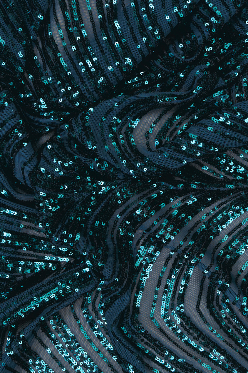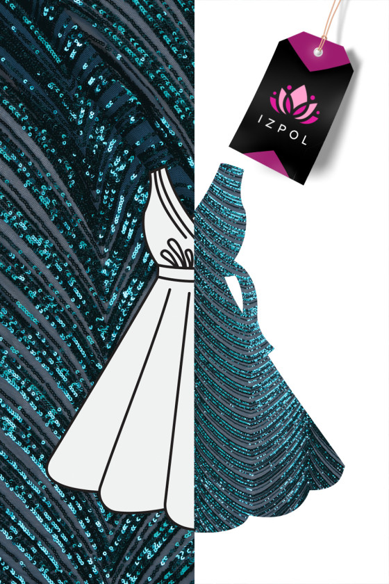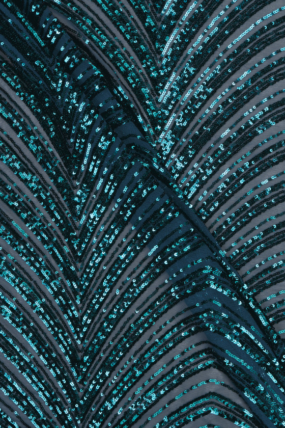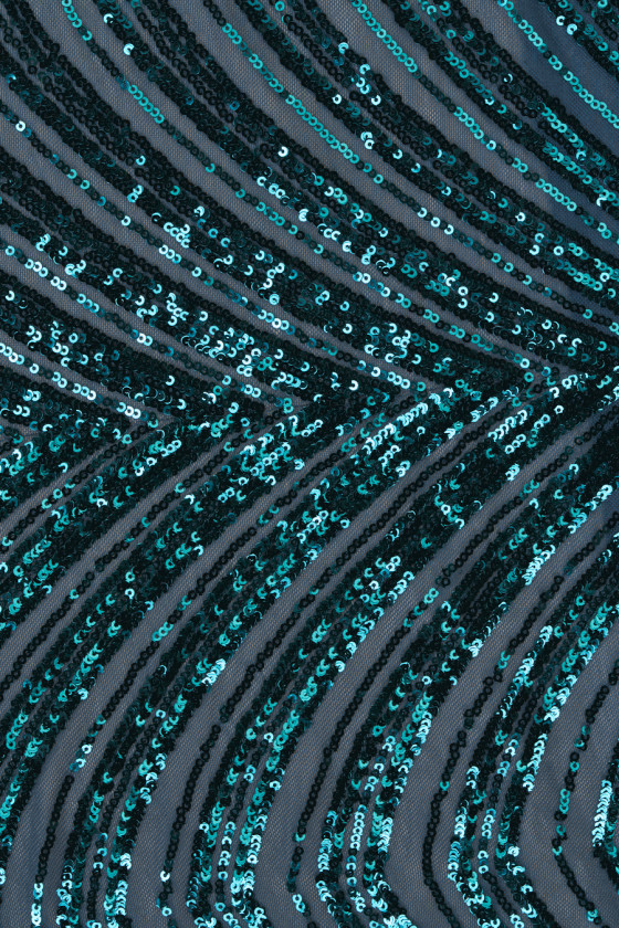 Talianska večerná tkanina vo veľmi elegantnej tmavozelenej farbe. Látka je vyrobená z mäkkej sieťoviny, elastickej v oboch smeroch, na ktorej sú našité lesklé flitre, ktoré tvoria vzor vlnovej alebo rybej kosti - šijeme ju po obvode. Látka je mäkká, priehľadná, vysoko elastická - krásny návrh pre ľudí, ktorí majú radi originálne vzory, ale v klasickej farbe. Tmavozelená je nadčasová farba, vždy módna, dodá každému strihu eleganciu a eleganciu.
