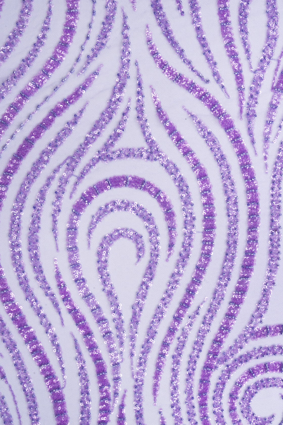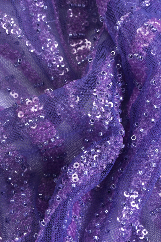 Talianska večerná látka vo fialovej farbe. Tuhý tyl v rovnakej farbe je bohato zdobený korálkami a flitrami v dvoch odtieňoch fialovej, ktoré sú usporiadané vo forme vĺn. Zahusťujú smerom k jednému okraju látky - šijeme ju po obvode. Fantastický návrh na šitie večerných šiat v najmódnejšej farbe. Látka pre ľudí, ktorí sledujú najnovšie módne trendy.