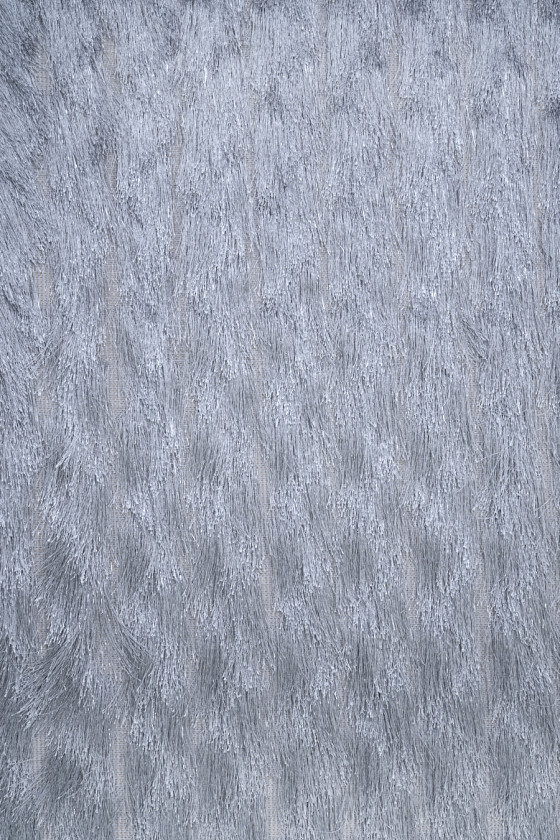 Večerná látka s našitými sivými strapcami a priehľadnými stuhami. Strapce šité vo forme vlny. Tkanina je mierne priehľadná, elastická a mäkká.