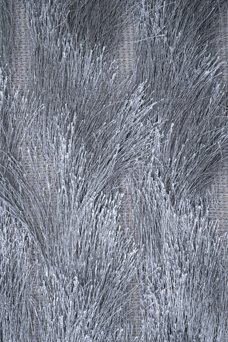 Večerná látka s našitými sivými strapcami a priehľadnými stuhami. Strapce šité vo forme vlny. Sieť je široká 140 cm, strapce široké 125 cm. Látka je mierne priehľadná, elastická a mäkká - krásny návrh na šitie večerných šiat, blúzky, sukne.