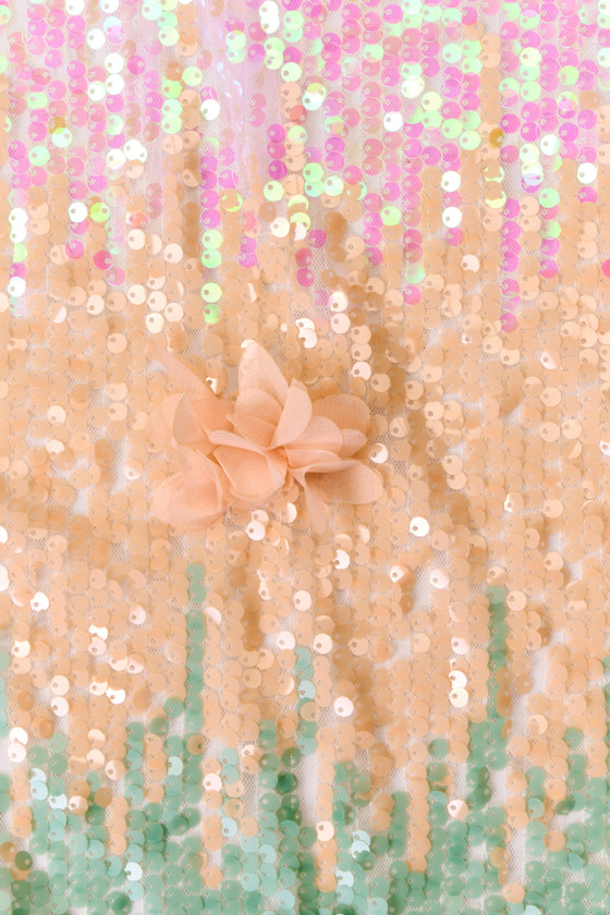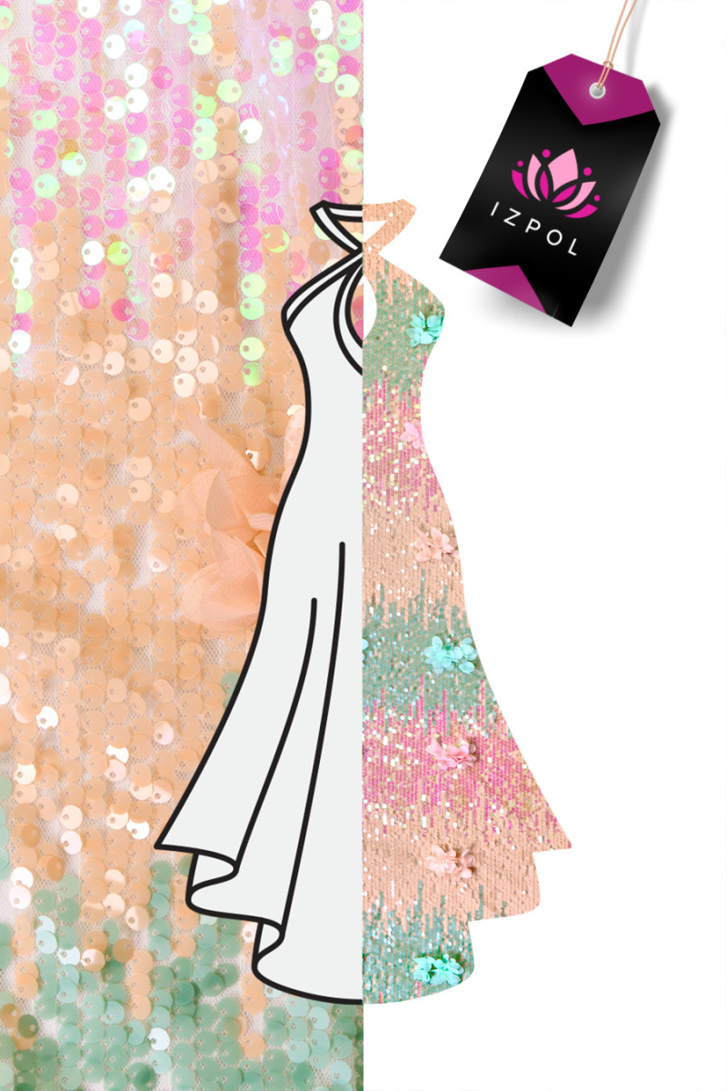 Taliansky tyl s klasickými očkami krémovej farby s husto šitými mätovými, ružovými a lososovými flitrami. Flitre sú pohyblivé a dúhové, látka je obohatená o pravidelne šité šifónové kvety, ktoré mierne vyčnievajú a vytvárajú 3D efekt. Krásne farby flitrov vytvárajú tieniaci efekt, ktorý prechádza z jednej farby do druhej každých približne 20 cm. Fantastický návrh na šitie večerných šiat, sukne alebo blúzky vo veľmi originálnom vydaní.