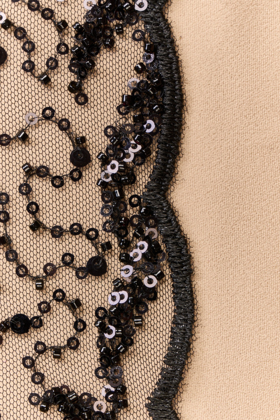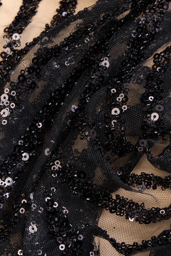 Taliansky, exkluzívny tyl s klasickými čiernymi očkami bohato zdobený čiernymi korálkami a flitrami. Vzor je usporiadaný do zvislých pruhov širokých 1,5 cm, ktoré sa rozširujú do polkruhov a zahusťujú sa smerom k jednému okraju - látka je šitá po obvode. Okraje látky zakončené čiernou niťou vytvárajú jemnú vlnu. Je ideálny na šitie večerných šiat, blúzky alebo sukne.