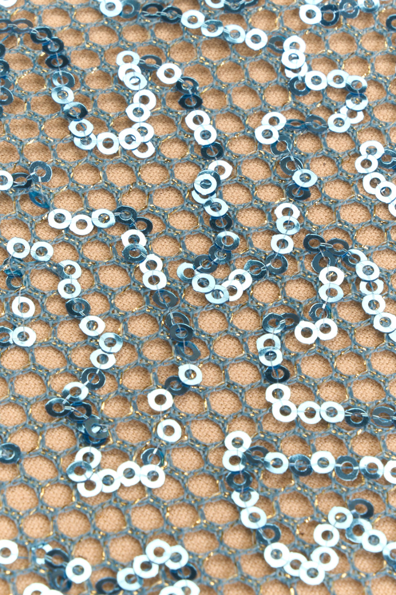 Talianska sieťovina v modrej farbe zdobená malými, modrými, nepravidelne umiestnenými flitrami a zlatou niťou. Látka je ľahká, mäkká, priehľadná a mierne elastická - funguje na nitiach. Veľmi pôsobivý návrh, ktorý je ideálny pre šaty, sukne, blúzky. Šírka látky je 160 cm, flitre sú umiestnené na šírke 140 cm.