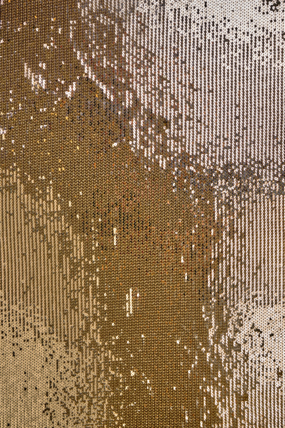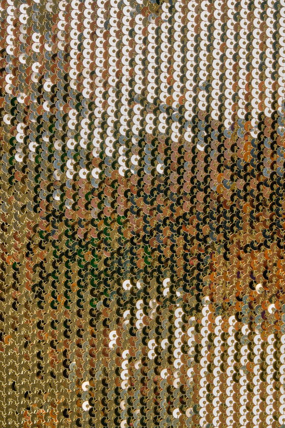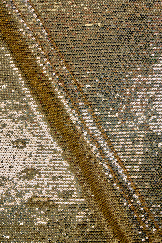 Exkluzívna flitrová látka v zlatej farbe. Husto a pravidelne usporiadané do línií 5 mm flitre, ktoré silne odrážajú svetlo a vytvárajú úžasný lesklý efekt. Flitre šité na béžovej elastickej sieťovine širokej 170 cm, flitre umiestnené na šírke 145 cm. Fantastický návrh na šitie večerných šiat, sukne alebo blúzky v oslnivom vydaní.