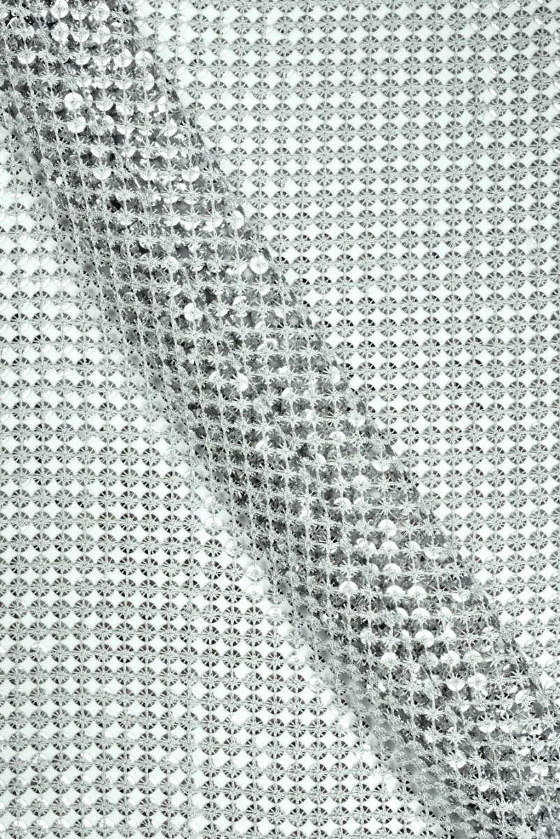 Exkluzívna flitrová sieťovina v striebornej farbe. Materiál pozostáva zo 7 mm lesklých flitrov položených pravidelne v líniách, vedľa seba a navzájom spojených striebornou niťou. Látka je ľahká, priehľadná, neelastická a splývavá. Skvelá ponuka pre ľudí, ktorí hľadajú zaujímavé a originálne riešenia v látke. Dá sa z neho vytvoriť sukne, blúzky, šaty alebo posteľné prikrývky.