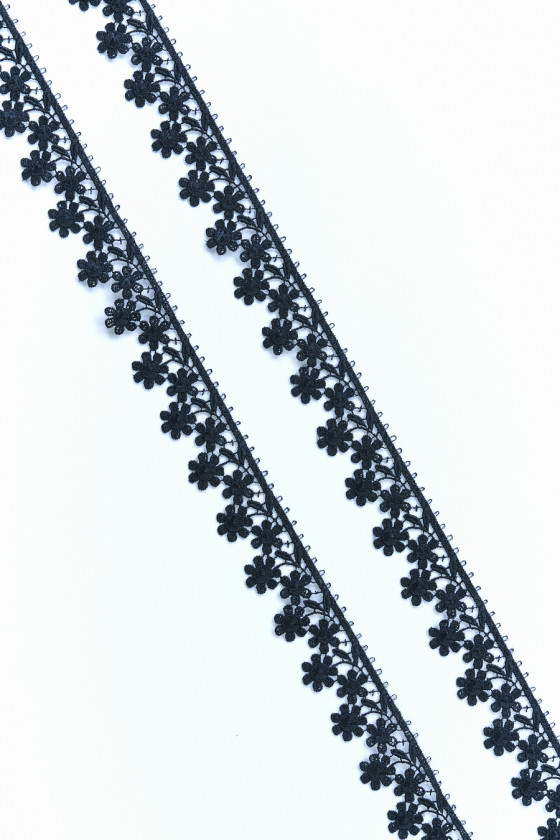 Talianska galantériová páska - guipure v čiernej farbe, široká 3cm. Krásny motív malých kvetov a listov spojených na vrchole pruhom. Fantastický návrh na konečnú úpravu hladkých tkanín.