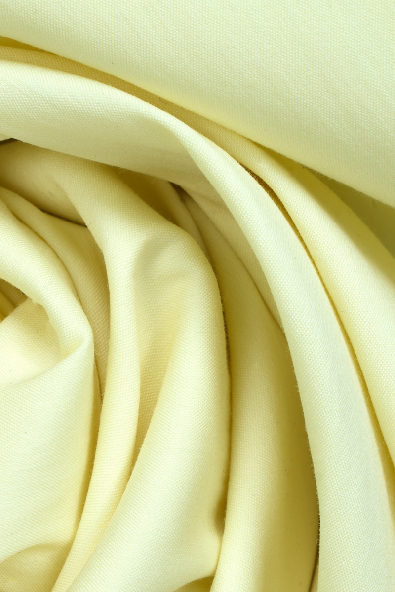 Talianska košeľová tkanina tkaná z viskózy a elastanu vo svetložltej farbe. Tkanina je tenká, ľahká a elastická, sú dokonale priedušné, čo poskytuje vysoký komfort používania. Ideálne na šitie košele, blúzky a letných šiat.