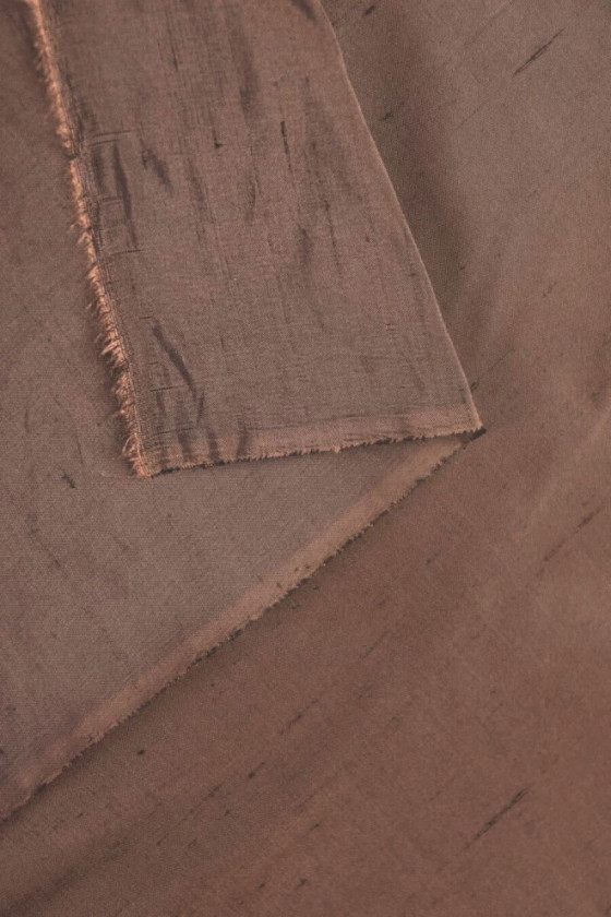 Dvojfarebný shantungský hodváb (čierna a lososová niť) hnedej farby s hladkou štruktúrou pripomínajúcou taft, so zahustením. Voľne tkaná látka, prirodzene farbená. Má mierne tuhú, plastovú štruktúru. Je vhodný na oblečenie aj na dekoráciu interiéru - záclony, vankúše atď. Iba chemické čistenie!