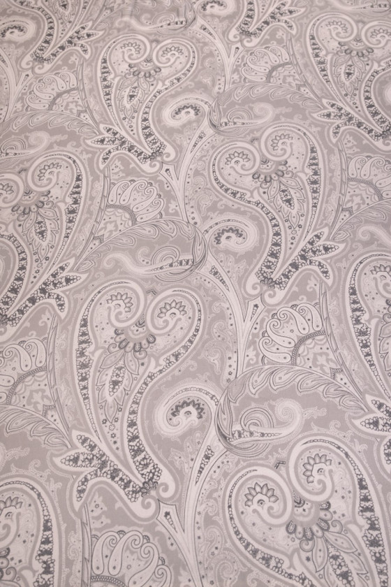 Hodvábny šifón, orientálny vzor paisley, odtiene šedej s čiernou. Je to veľmi jemná, priehľadná tkanina (vyžaduje podšívku).