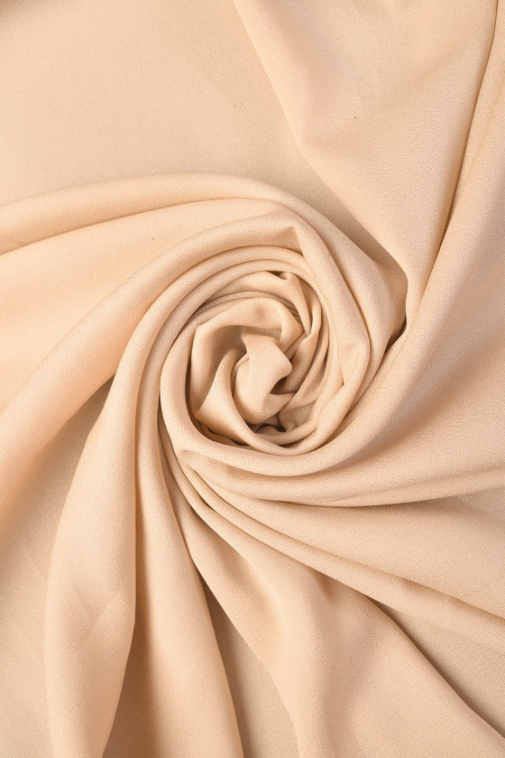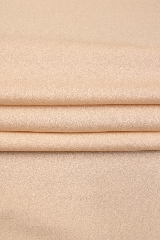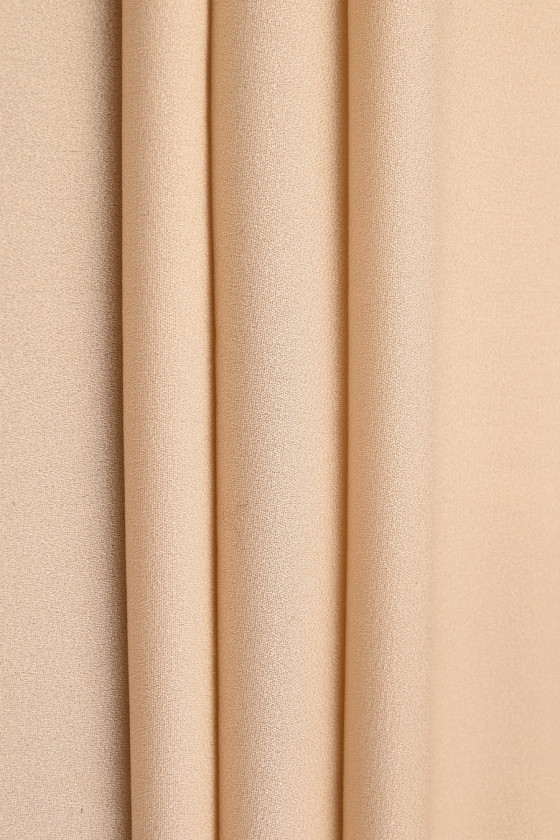 Púdrovo béžová hodvábna tkanina s žoržetovitou väzbou. Nepriehľadná, matná látka pekne sedí na postave.