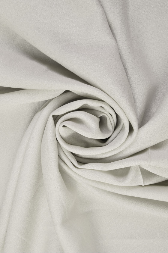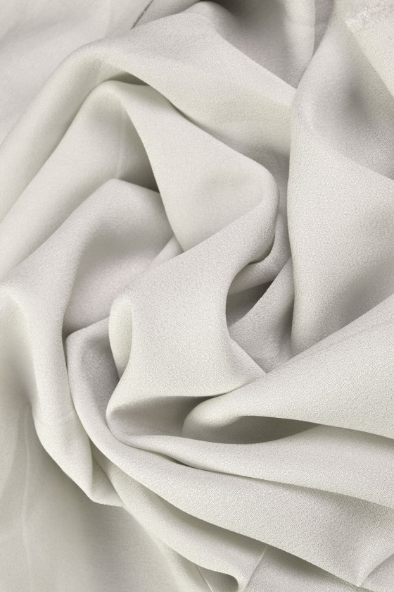 Hodvábna tkanina vo svetlej popolavej farbe s väzbou pripomínajúcou georgette. Nepriehľadná, matná látka pekne sedí na postave.