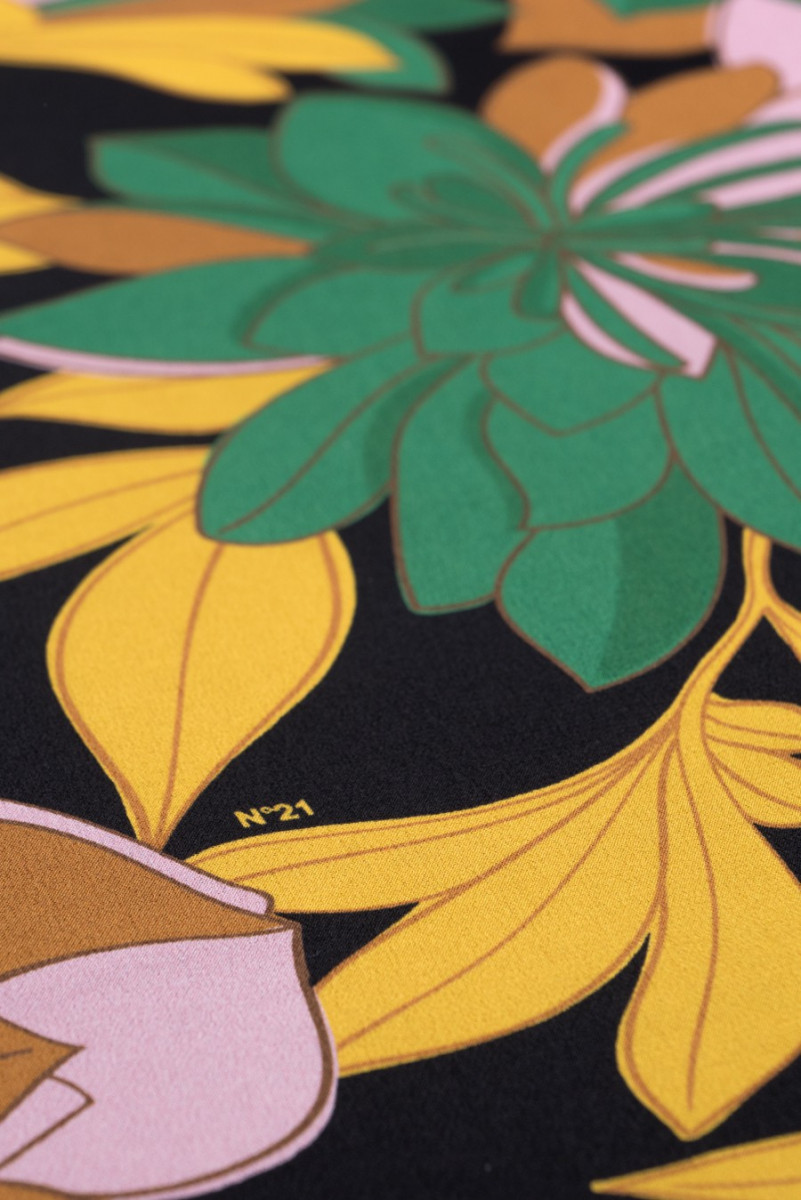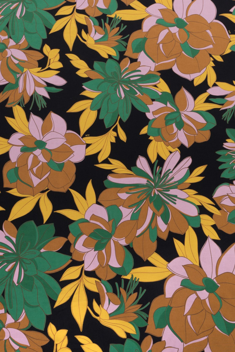 100% hodvábny krep od č. 21 s veľkými kvetmi v nasledujúcich farbách: ružová, zelená, škoricová a žltá na čiernom pozadí.