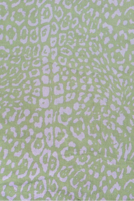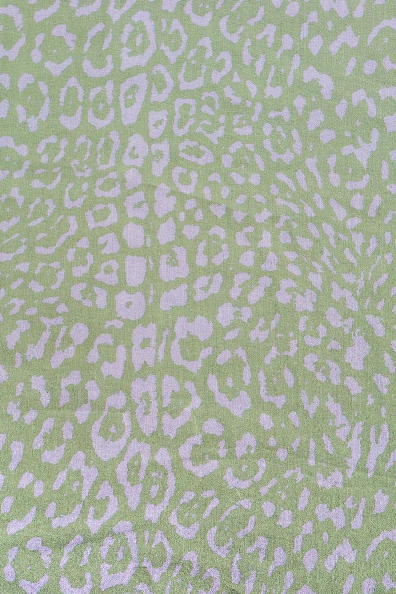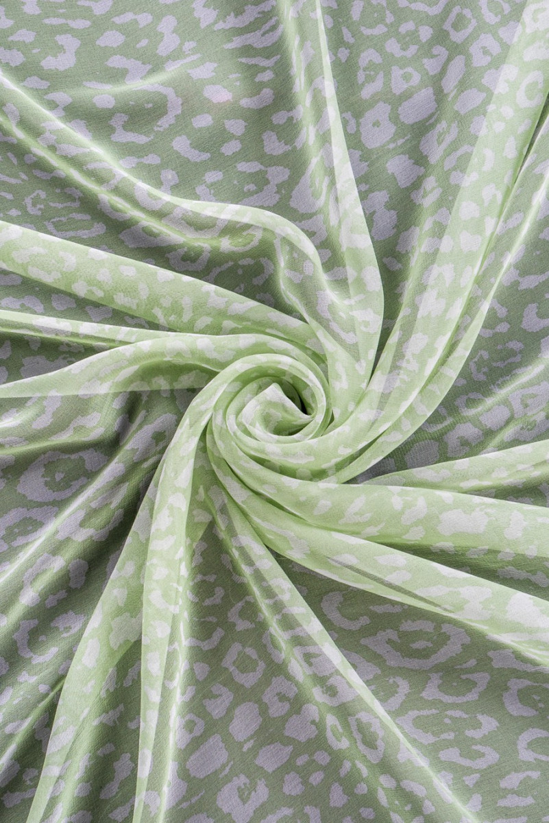 Hodvábna georgette vo farbe zelenej pistácie s bielou leopardou potlačou. Je to matná, veľmi jemná, polopriehľadná tkanina (vyžaduje podšívku).