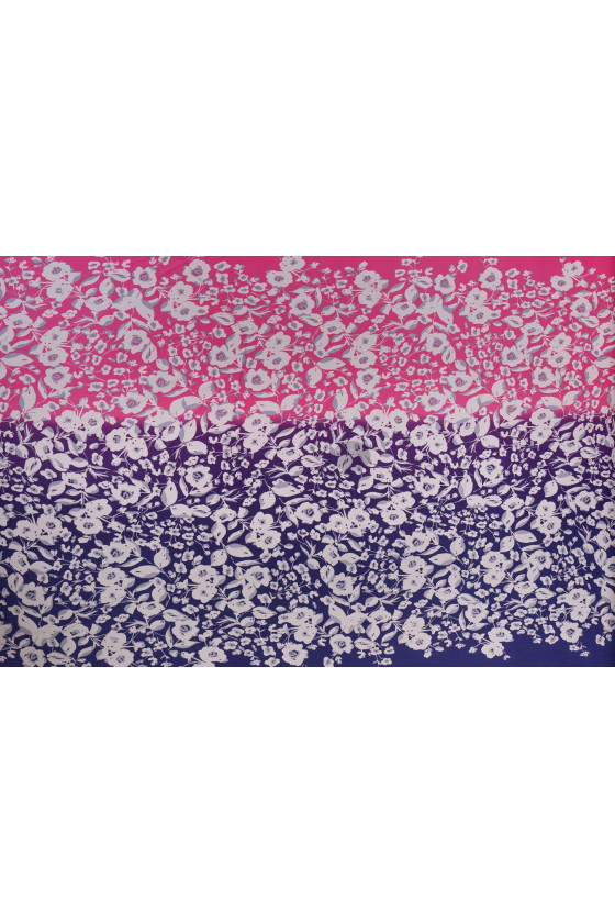 Talianska, neelastická hodvábna tkanina habotai. Zaujímavý motív bielych a sivých kvetov na ružovom pozadí, ktoré sa menia na fialovú. Vzor sa vyskytuje periférne. Ideálne na šitie vzdušných šiat, blúzky, sukne, šálu.