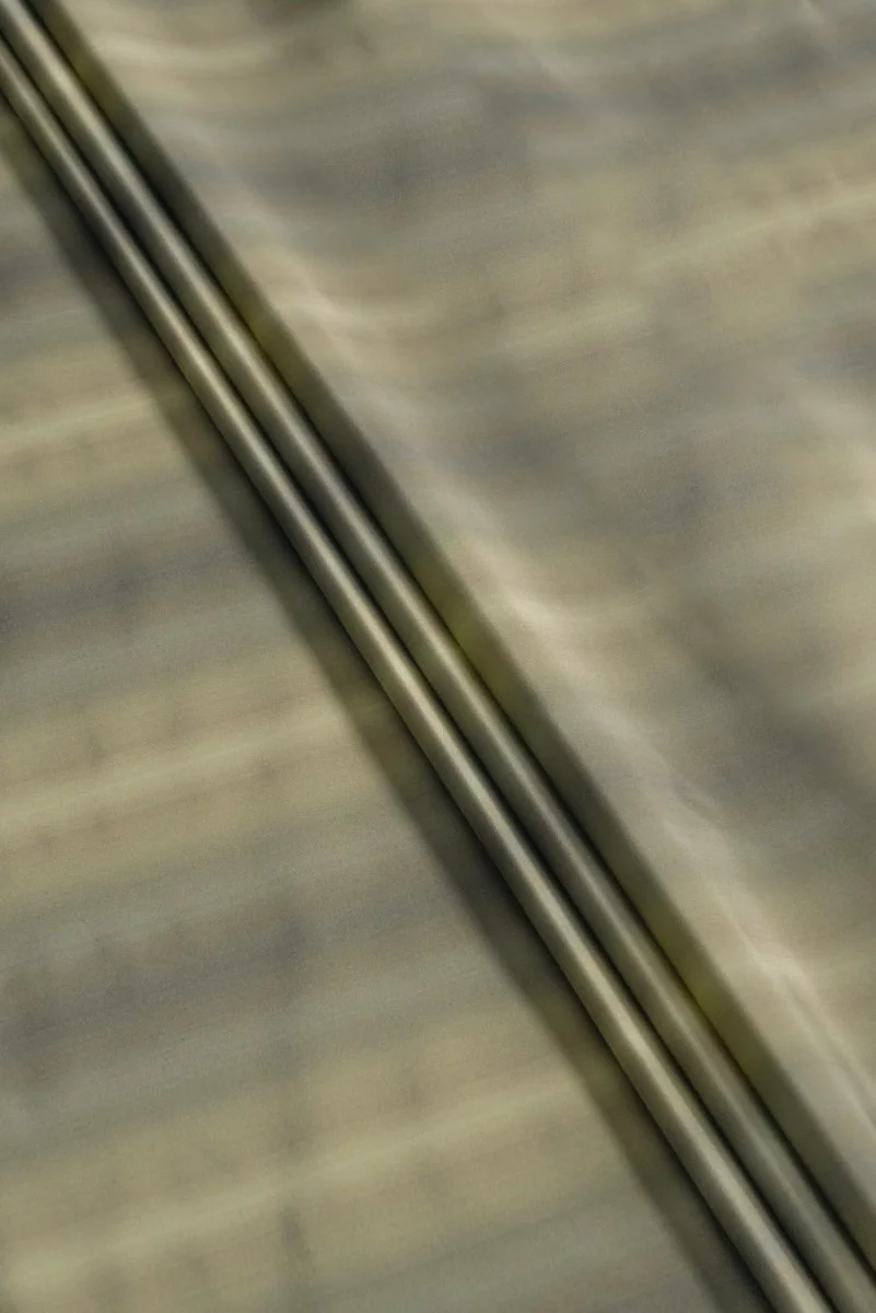 Taliansky 100% hodvábny taft so zaujímavým motívom rozmazaných pruhov v béžovej a olivovej farbe. Tenká, ale nepriehľadná, tuhá tkanina - ideálna na šitie šiat, sukne, blúzky.