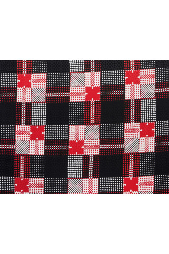 Talianska 100% hodvábna tkanina so žakárovou väzbou, geometrické motívy v nasledujúcich farbách: čierna, červená a krémová. Ľahká, mäkká, splývavá tkanina - ideálna na šitie košele, šiat, vzdušnej sukne, blúzky alebo šálu.