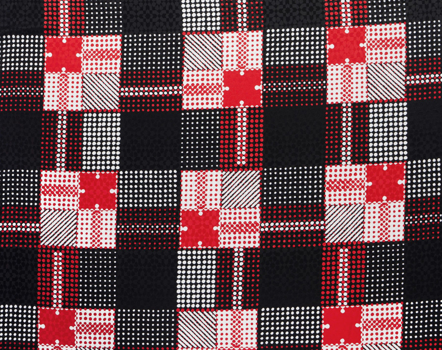 Talianska 100% hodvábna tkanina so žakárovou väzbou, geometrické motívy v nasledujúcich farbách: čierna, červená a krémová.