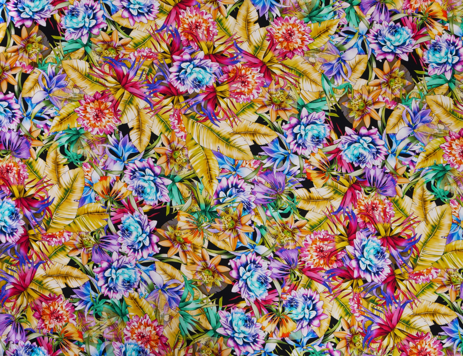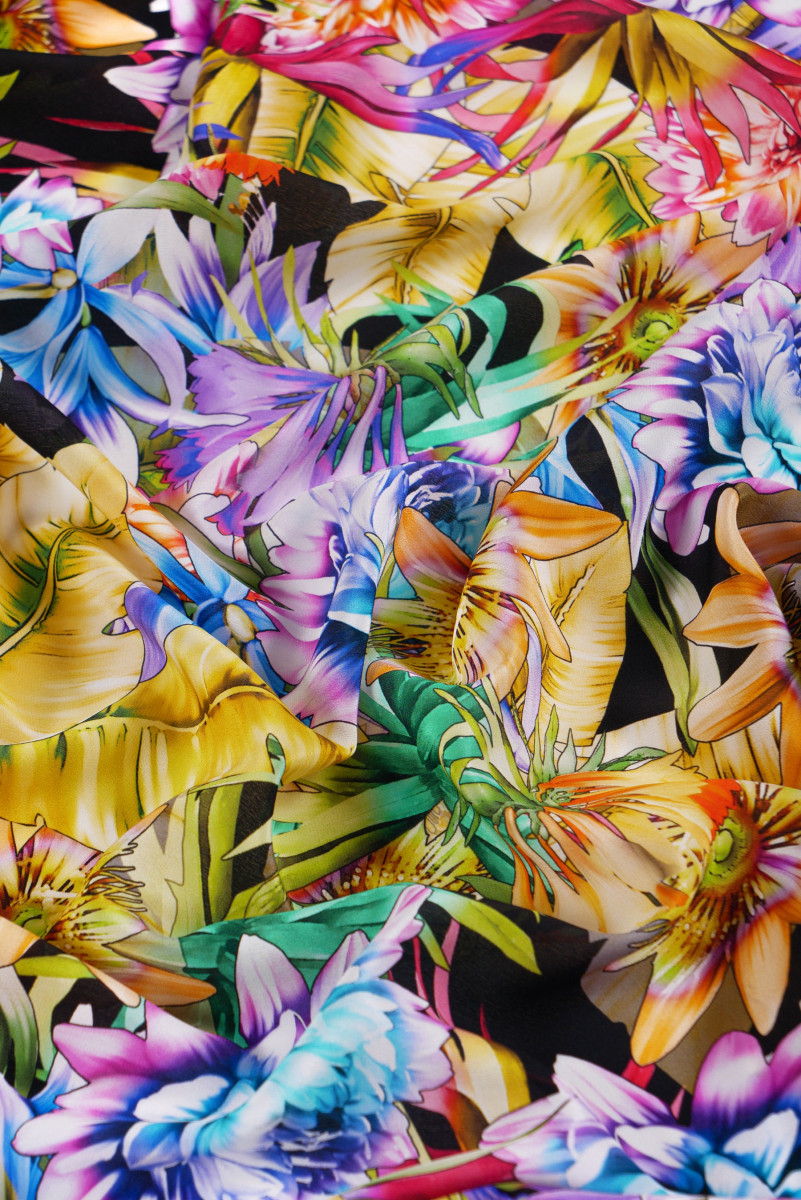 Taliansky krep 100% hodváb s farebnými kvetmi a listami. Hodvábny krep je jemná, tenká, polomatná tkanina.