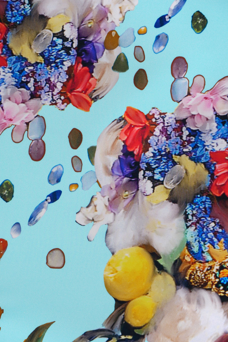 Taliansky 100% hodvábny krep vo svetlej tyrkysovej farbe s motívom farebných ovocných a kvetinových kompozícií obklopený malými kamienkami.