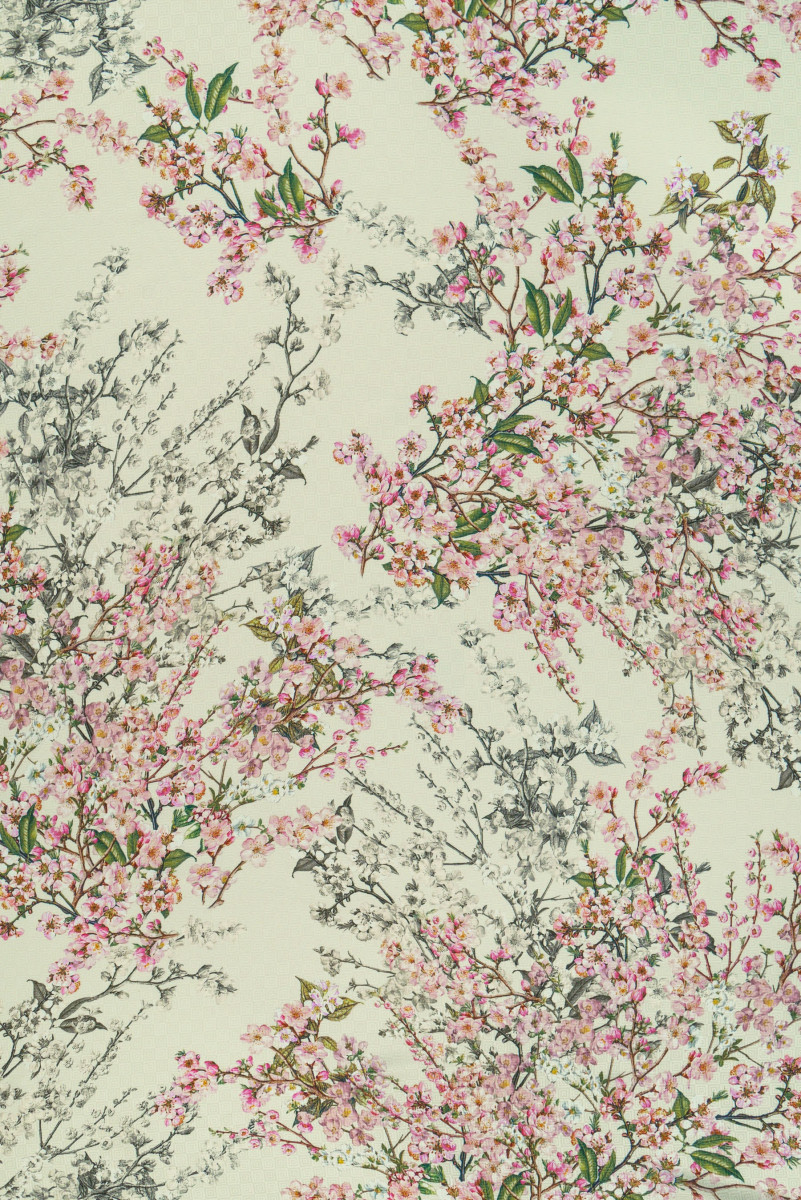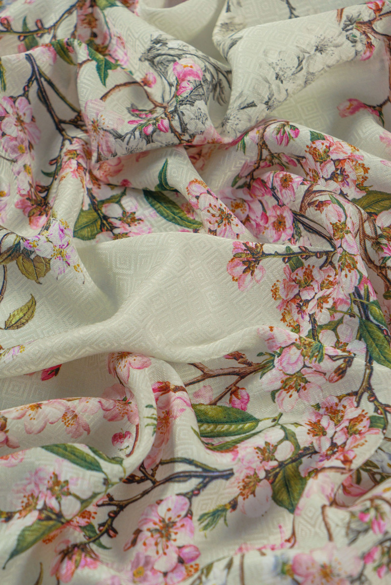 Krásna talianska 100% hodvábna tkanina v béžovej a olivovej farbe s motívom vetvičky s čerešňovými kvetmi v šedej a ružovej farbe. Tkanina s veľmi originálnou žakárovou väzbou vo forme matnej lesklej kocky.