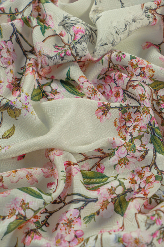 Krásna talianska 100% hodvábna tkanina v béžovej a olivovej farbe s motívom vetvičky s čerešňovými kvetmi v šedej a ružovej farbe. Tkanina s veľmi originálnou žakárovou väzbou vo forme matnej lesklej kocky. Neelastická, ľahká, nepriehľadná tkanina s jemným leskom - ideálna na šitie elegantných šiat, blúzky, sukne alebo šálu.