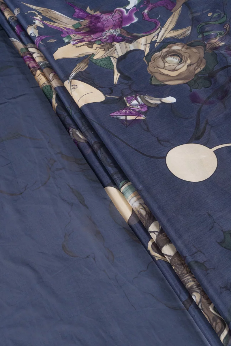 Talianska 100% hodvábna organzová tkanina vo veľkosti kupónu 135 cm*140 cm. Krásny motív fantazijných postáv na grafitovom pozadí, látka podpísaná názvom známeho módneho domu.