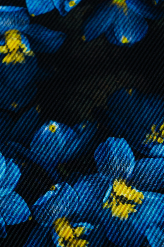 Talianska hodvábna keprová tkanina vo veľkosti kupónu 125cm * 140cm. Látka s veľkým kvetinovým motívom v écru a modrej farbe na čiernom podklade. Látka je mäkká, tenká, ale nepriehľadná, ľahká - ideálna na šitie šiat, sukne alebo šálu.