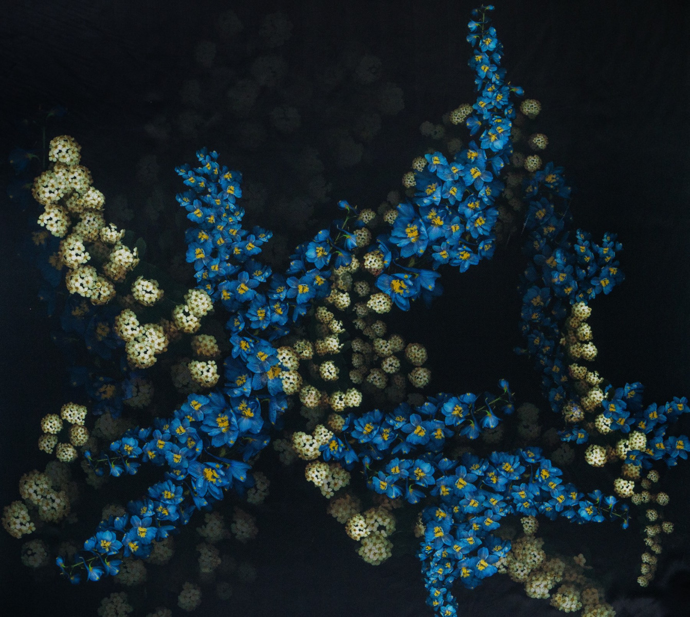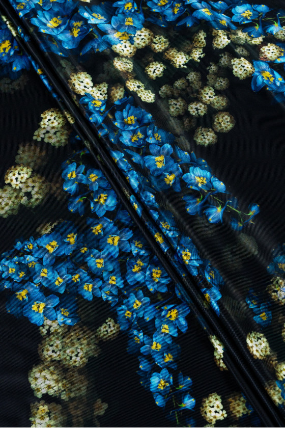 Talianska hodvábna keprová tkanina vo veľkosti kupónu 125cm * 140cm. Látka s veľkým kvetinovým motívom v écru a modrej farbe na čiernom podklade.