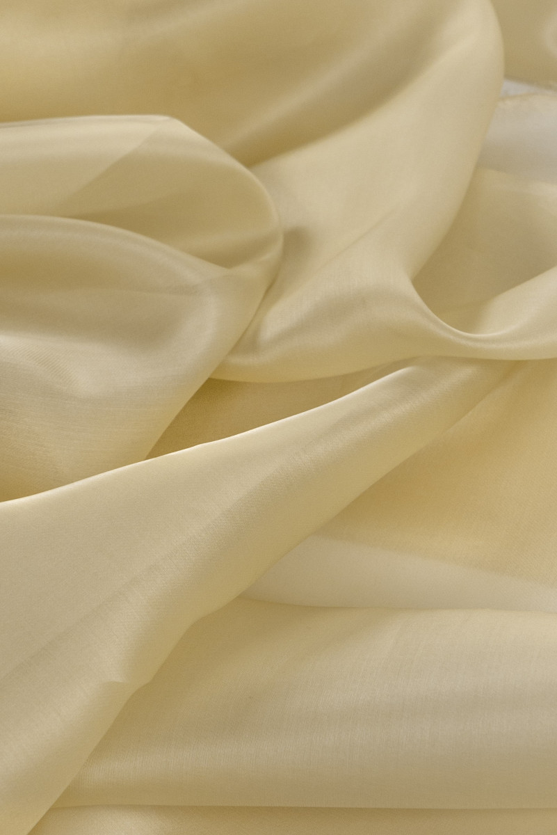 Talianska 100% hodvábna organza tkanina v béžovej farbe s motívom listov. Látka sa dodáva v kupóne s rozmermi 75 cm * 140 cm. Prírodná hodvábna organza je tenká, priehľadná, ale tuhá tkanina s jemným leskom charakteristickým pre hodvábne tkaniny. Ideálne na šitie šiat, blúzky, košele, sukne.
