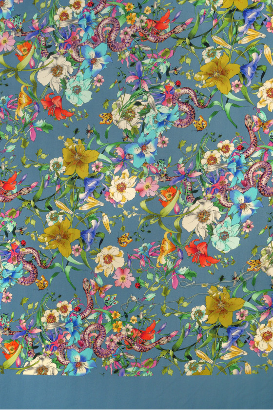 Talianske cadi šaty tkané zo sójových vlákien a prírodného hodvábu. Krásny motív kvetov, motýľov a hada na šedo-modrom pozadí, látka na jednej strane je ukončená hladkým okrajom širokým 15 cm - šijeme ho po obvode.