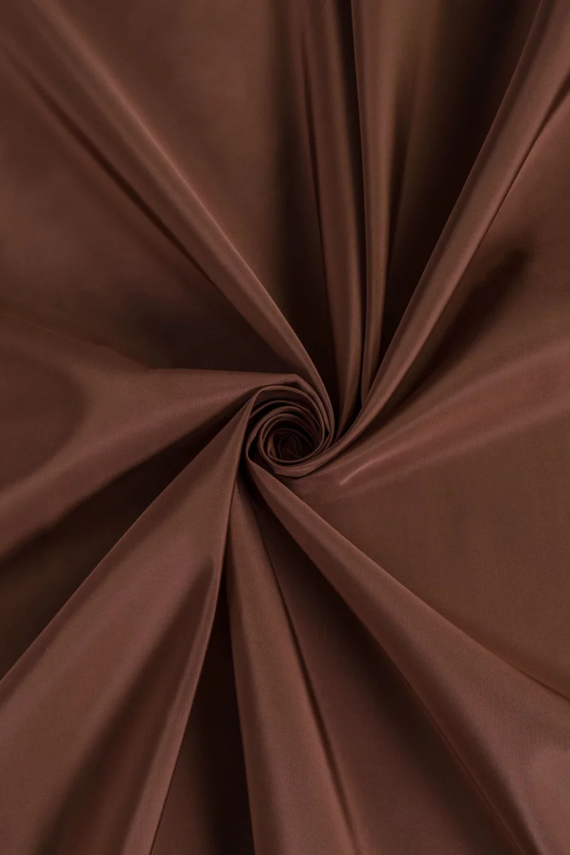 Talianska 100% hodvábna taftová tkanina v svetlohnedej farbe s jemnou rebrovanou väzbou. Prírodný hodvábny taft je tenká, ale tuhá tkanina s jemným leskom charakteristickým pre hodvábne tkaniny. Ideálne na šitie šiat, sukne, bundy alebo na dekoratívne účely.