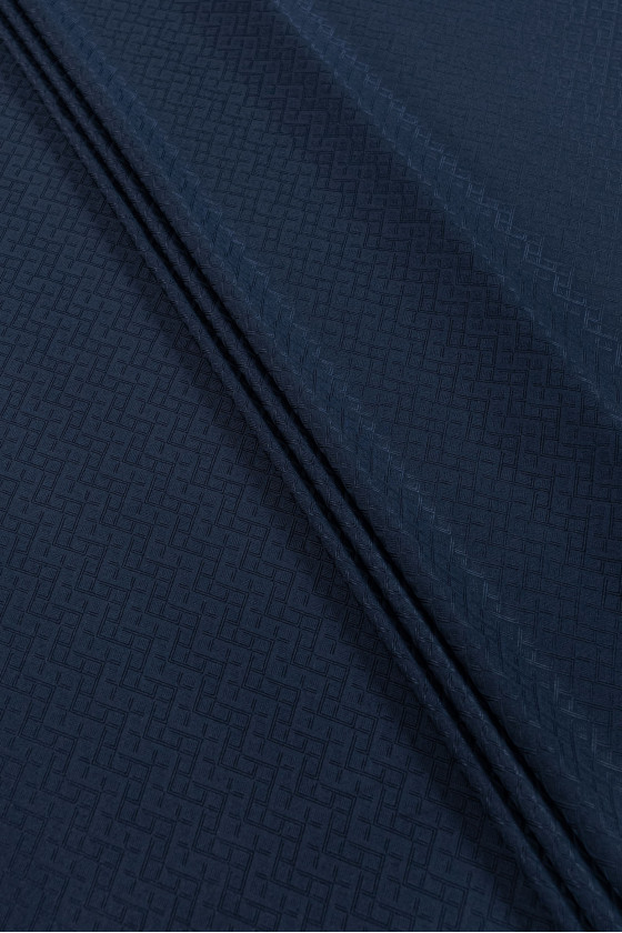 Talianska 100% hodvábna tkanina v námorníckej modrej, žakárová tkanina s geometrickým motívom - diamanty. Neelastická, tenká, mierne priehľadná, ľahká tkanina s leskom charakteristickým pre hodvábne tkaniny. Ideálne na šitie košele, blúzky, voľnej sukne, šiat alebo šálu. Zloženie: 100% prírodný hodváb