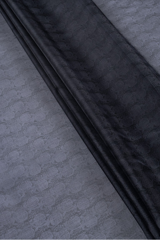 Talianska 100% hodvábna organza látka v čiernej farbe s motívom sivých kvetov. Prírodná hodvábna organza je tenká, priehľadná, ale tuhá tkanina s jemným leskom charakteristickým pre hodvábne tkaniny.