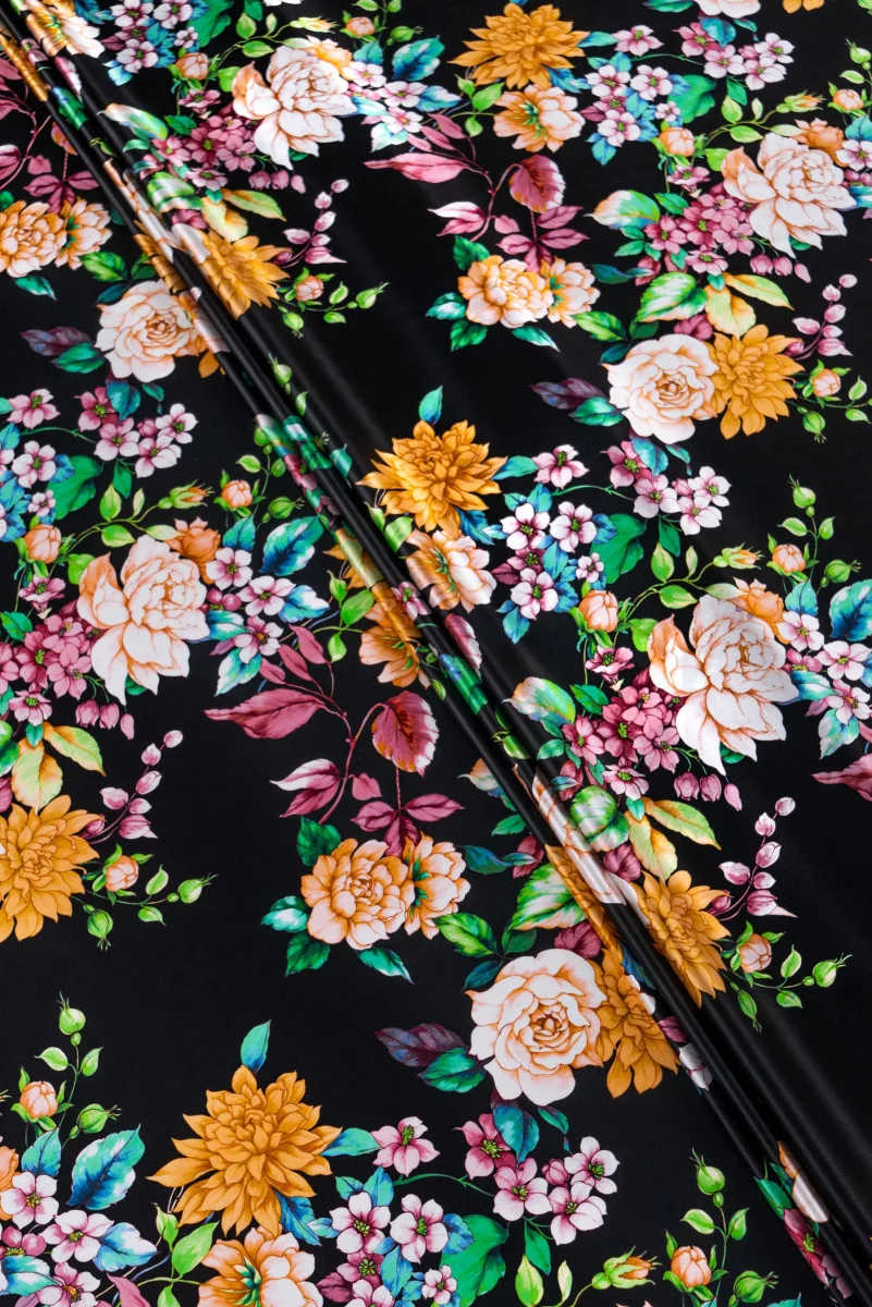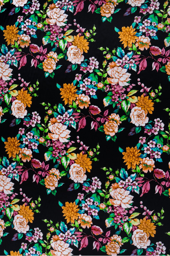 Taliansky 100% hodvábny satén v čiernej farbe so stredne veľkým kvetinovým motívom. Hodvábny satén je hustá a ľahká tkanina s rovným povrchom, vyrobená v saténovej väzbe.
