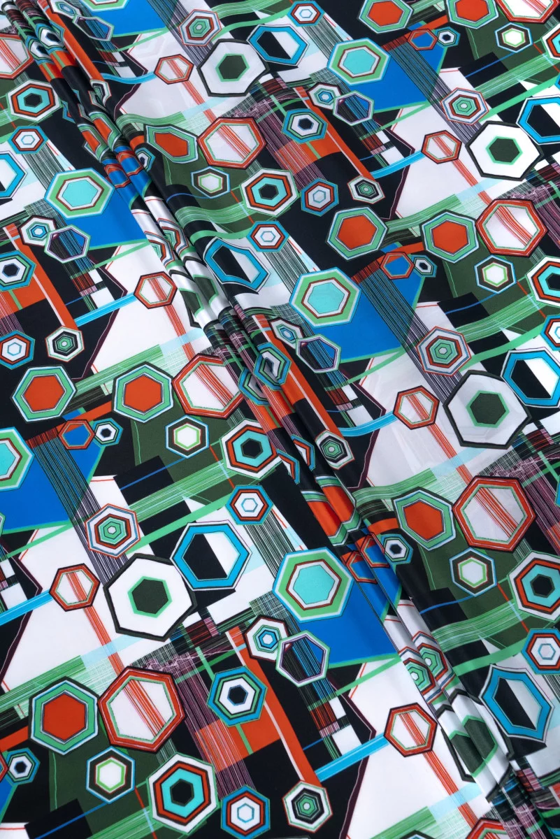 Taliansky 100% hodvábny satén s geometrickými vzormi 3 - 7 cm v zelenej, modrej a oranžovej farbe - potlač je vyhotovená na matnej strane.
