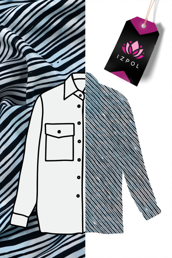 Talianska 100% hodvábna keprová tkanina s čiernymi, priečnymi pruhmi na tieňovanom pozadí v modrej a krémovej farbe. Látka je podpísaná názvom známeho módneho domu. Hodvábny kepr je tkanina s keprovou väzbou, mäkká, veľmi odolná, jemne tuhá. Perfektné na šitie košele, šiat, sukne alebo šálu/šatky.
