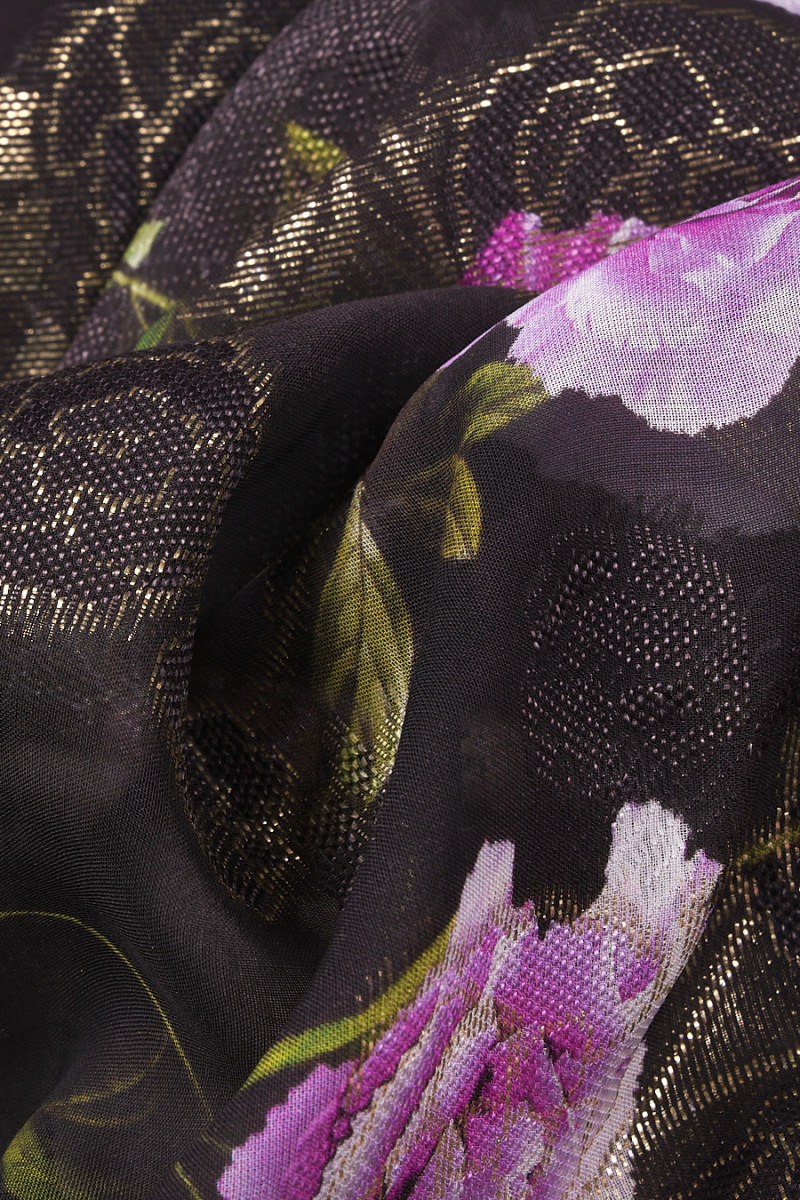 Taliansky 100% hodvábny mušelín v čiernej farbe s motívom ružových kvetov a čierno-zlatých kvetov a listov tkaných technikou devore. Tkanina devore je kombináciou hladkého, priehľadného hodvábneho mušelínu s nepriehľadnými, matnými kvetmi a listami zdobenými lurexovou niťou.