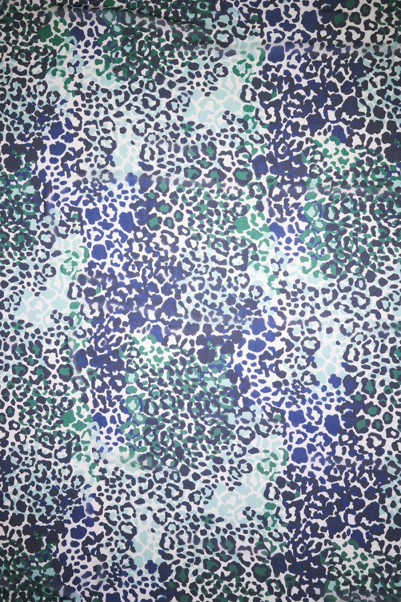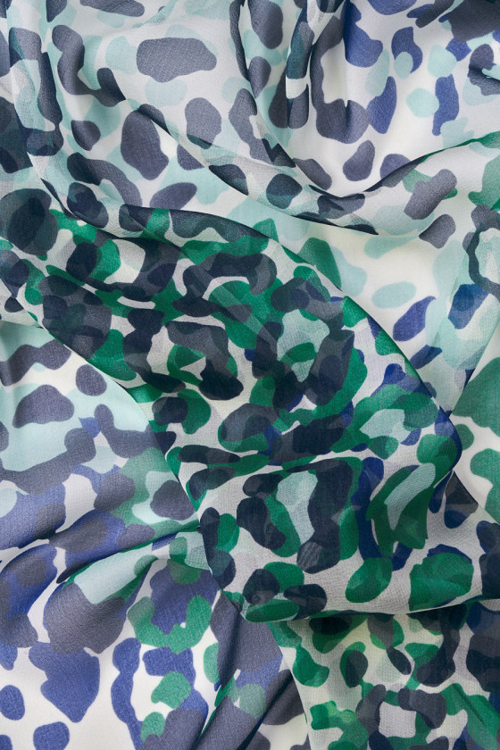 Taliansky šifón 100% hodváb v šedej a zelenej farbe s motívom leopardej potlače na chrpu modrej so zelenými akcentmi. Hodvábny šifón je tenká, priehľadná, matná, ľahká a vzdušná tkanina. Ideálne na šitie šiat, blúzky, sukne alebo šálu.