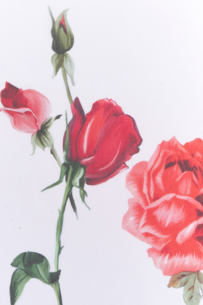 Taliansky šifón 100% hodváb v krémovej farbe s motívom ružových, červených a žltých ružových kvetov. Hodvábny šifón je tenká, priehľadná, matná, ľahká a vzdušná tkanina.