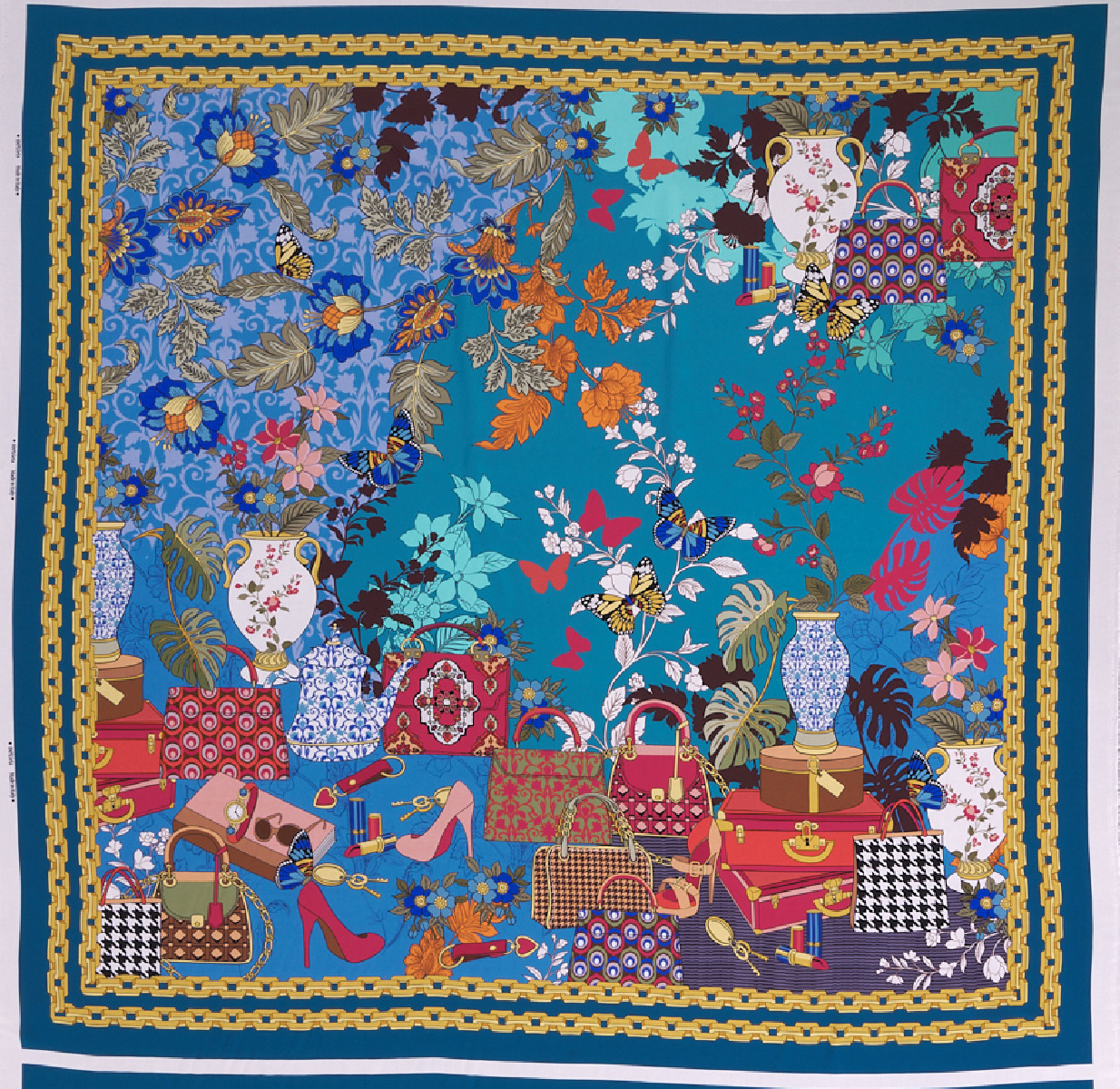 Taliansky 100% hodvábny krep v kupóne s rozmermi 130 cm* 140 cm s motívom tašiek, topánok, váz a listov na morskom pozadí. Hodvábny krep je jemná, tenká, polomatná tkanina. Je jemný na dotyk a veľmi dobre sedí. Dá sa z neho vykúzliť vzdušné šaty, jemné blúzky, sukne, šatky, šatky.