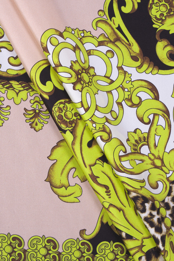Talianska 100% hodvábna tkanina v kupóne s rozmermi 135 cm * 140 cm s motívom zlatých ozdôb a leopardej potlače na béžovom podklade. Tkanina je jemná, tenká, ale nepriehľadná, polomatná. Je jemný na dotyk a veľmi dobre sedí. Dá sa z neho vykúzliť vzdušné šaty, jemné blúzky, sukne, šatky, šatky.