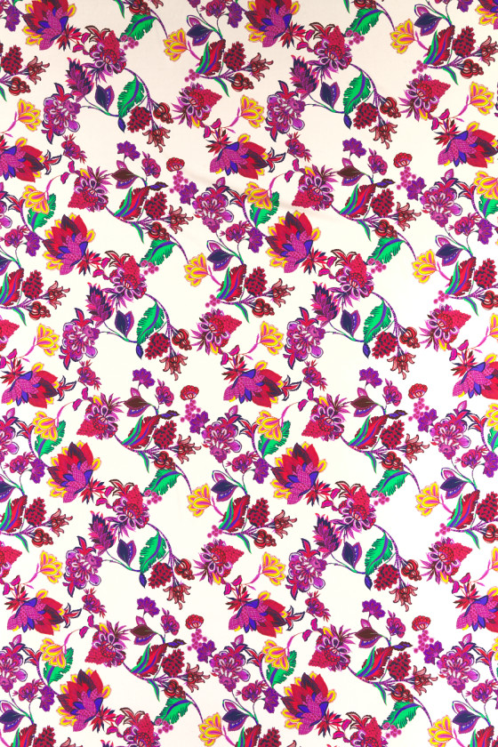 Taliansky hodvábny satén, elastický vo farbe ecru s motívom farebných kvetov - potlač je vyhotovená na matnej strane.