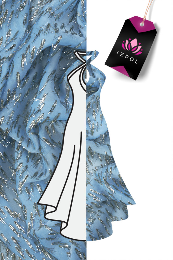 Taliansky hodvábno-viskózový šifón v modrej farbe s motívom zlatých strapcov, dlhý 2 cm, vyrobený z lurexovej nite. Šifón je tenká, priehľadná, matná, ľahká a vzdušná tkanina.