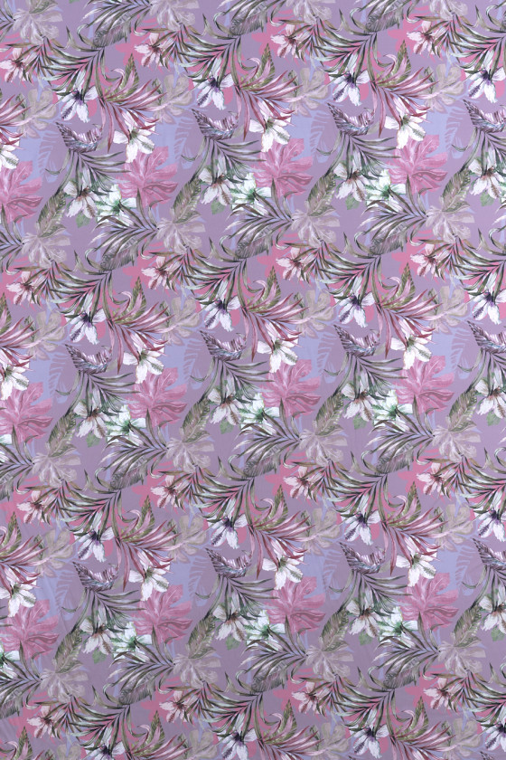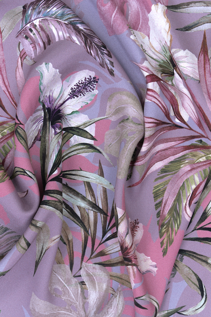 Taliansky hodvábny satén, elastický s krásnym kvetinovým motívom. Na pozadí v špinavej ružovej a tlmenej fialovej farbe bol vytlačený vzor kvetov ľalie krémovej farby obklopených zelenými palmovými listami - potlač bola vyrobená na matnej strane. Celok je udržiavaný vo veľmi tlmených farbách, takže táto látka je ideálna pre elegantné výlety, ako je prijímanie alebo svadobný obrad.