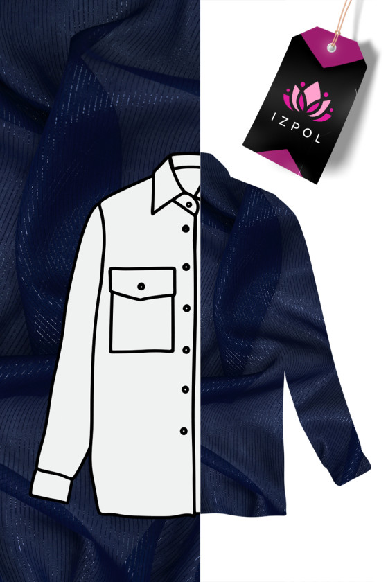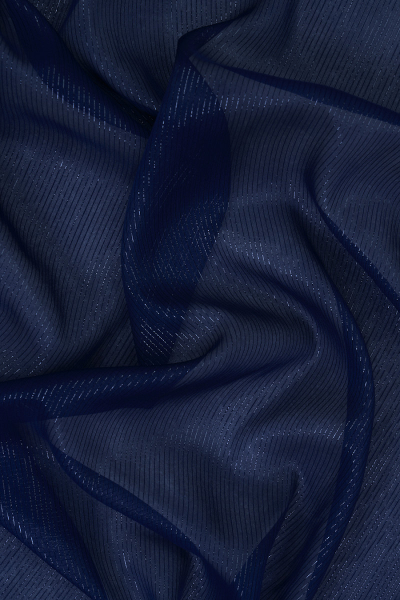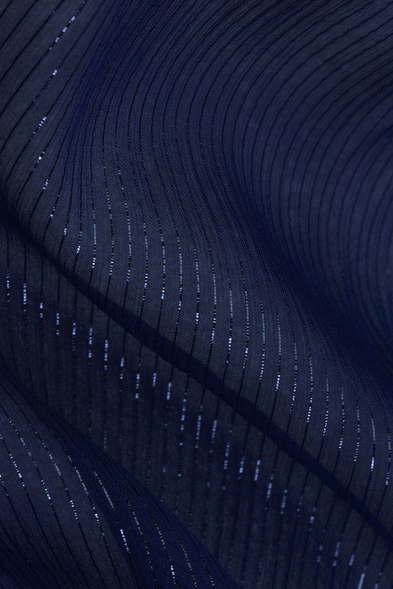 Taliansky 100% hodvábny mušelín v námorníckej modrej farbe zdobený lurexovou niťou v rovnakej farbe. Dekoratívna niť vytvára veľmi malé, zvislé pruhy. Látka je tenká a priehľadná, jemne lesklá vďaka lurexu. Je ideálny na šitie elegantnej košele, blúzky, sukne alebo šiat. Fantastický návrh pre fanúšikov klasických vzorov a farieb, ale s mierne moderným nádychom.