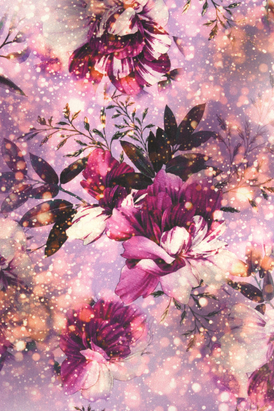 Taliansky hodvábny satén s prídavkom elastanu s potlačou na matnej strane. Krásny, hustý motív ružových kvetov vo fialových farbách s čiernymi a krémovými akcentmi. Celok je vyrobený na tieňovanom fialovo-krémovom pozadí s malými bodkami, ktoré pripomínajú sneh. Fantastický návrh pre ľudí, ktorí majú radi kvetinové motívy v pokojných farbách. Táto látka je ideálna na šitie šiat, sukne alebo krásnej košele.