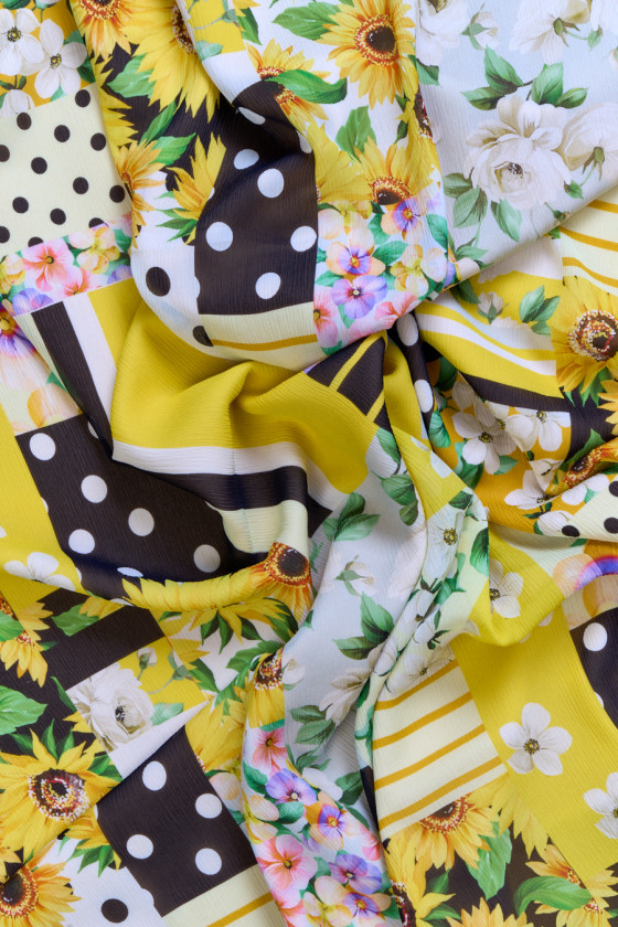 Taliansky šifón zo 100% hodvábneho záhybu s kvetinovým motívom naaranžovaný v podobe patchworku v dominantnej žltej farbe a kontrastujúci s ním čiernou. Zaujímavá kombinácia čírych slnečníc s jemnými sirôtkami a ružami, ako aj bodiek a pomlčiek vytvára originálny vzor materiálu. Látka je ľahká, vzdušná, mierne priehľadná, elastická - funguje na nitiach. Krásna ponuka na vytvorenie jedinečných šiat, blúzky alebo šatky.