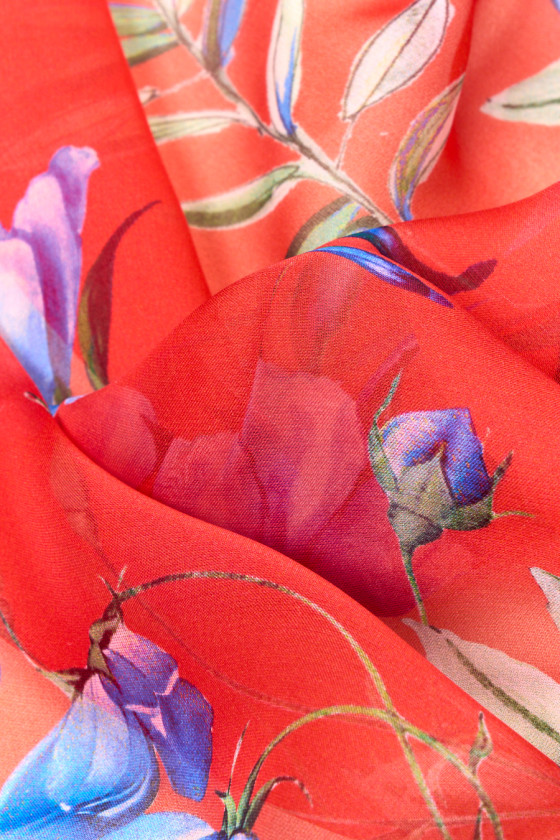 Taliansky 100% hodvábny mušelín s motívom modrých, žltých a krémových kvetov na červenom podklade, celok dopĺňajú listy a stonky v tlmených odtieňoch zelenej. Prírodný hodvábny mušelín je veľmi jemná, vzdušná, priehľadná tkanina s jemným leskom charakteristickým pre hodvábne tkaniny. Ideálne pre ľahké šaty, blúzky alebo sukne.