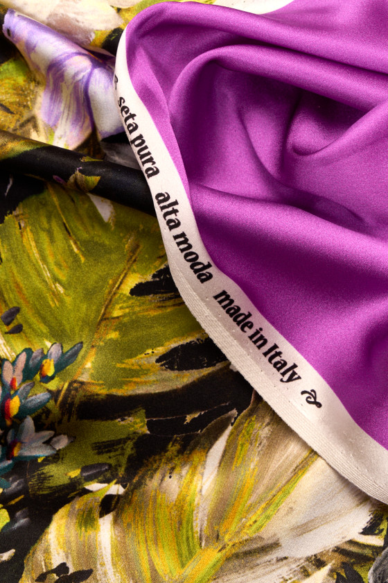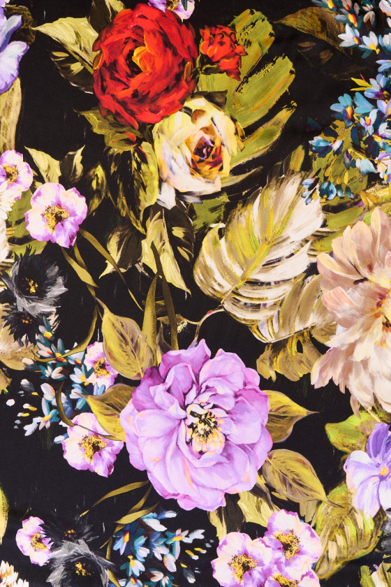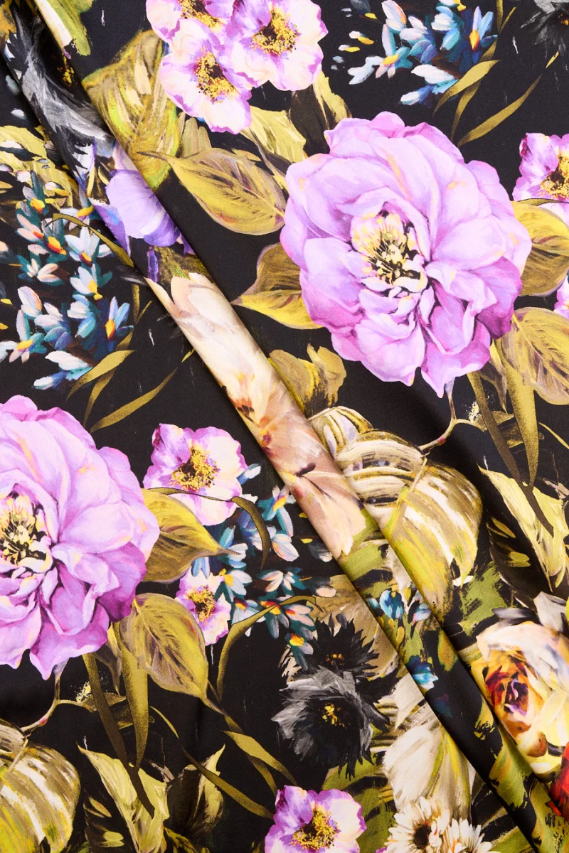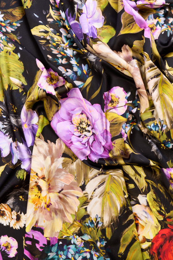 Taliansky hodvábny satén s prídavkom elastanu s maľovanými kvetmi na čiernom pozadí. Veľké kvetinové motívy rôznych veľkostí v odtieňoch fialovej, zelenej, červenej, čiernej obohatené o menšie kvety v morskej farbe. Jeden okraj je zdobený fialovým okrajom širokým 16 cm. Krásna ponuka pre ľudí, ktorí majú radi kvetinové vzory. Pridanie elastanu uľahčuje nosenie a menej vrások. Je ideálny na šitie originálnej košele, šiat, sukne a voľnejších nohavíc.